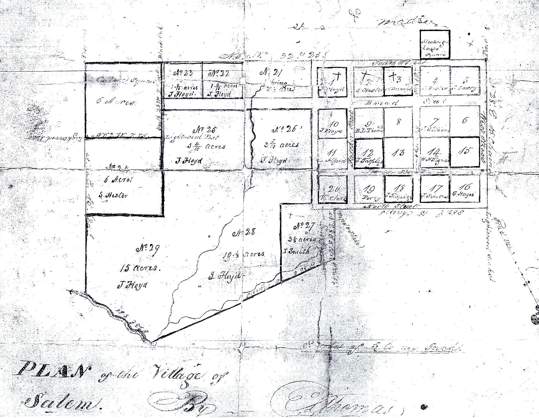 The prominent citizens who had Salem incorporated in 1818 approached its development like true sons of the Enlightenment: in an orderly, rational and democratic way. Salem’s act of incorporation called for governance by three commissioners to be elected annually. The commissioners passed an act in May 1821 to define the town limits, which extended from the town center one-half mile in all directions. From the plat map, drawn on July 4, 1820, one can see how a little less than half of the town was laid out in square blocks, each numbered and bearing the name of its owner. On one corner of the town sits a six-acre lot, inscribed “Colledge (sic) Square” along the southern edge, another two and one-half acre lot reads “Spring” and jutting out from the southern border sits a lot called “Meetinghouse Square.”