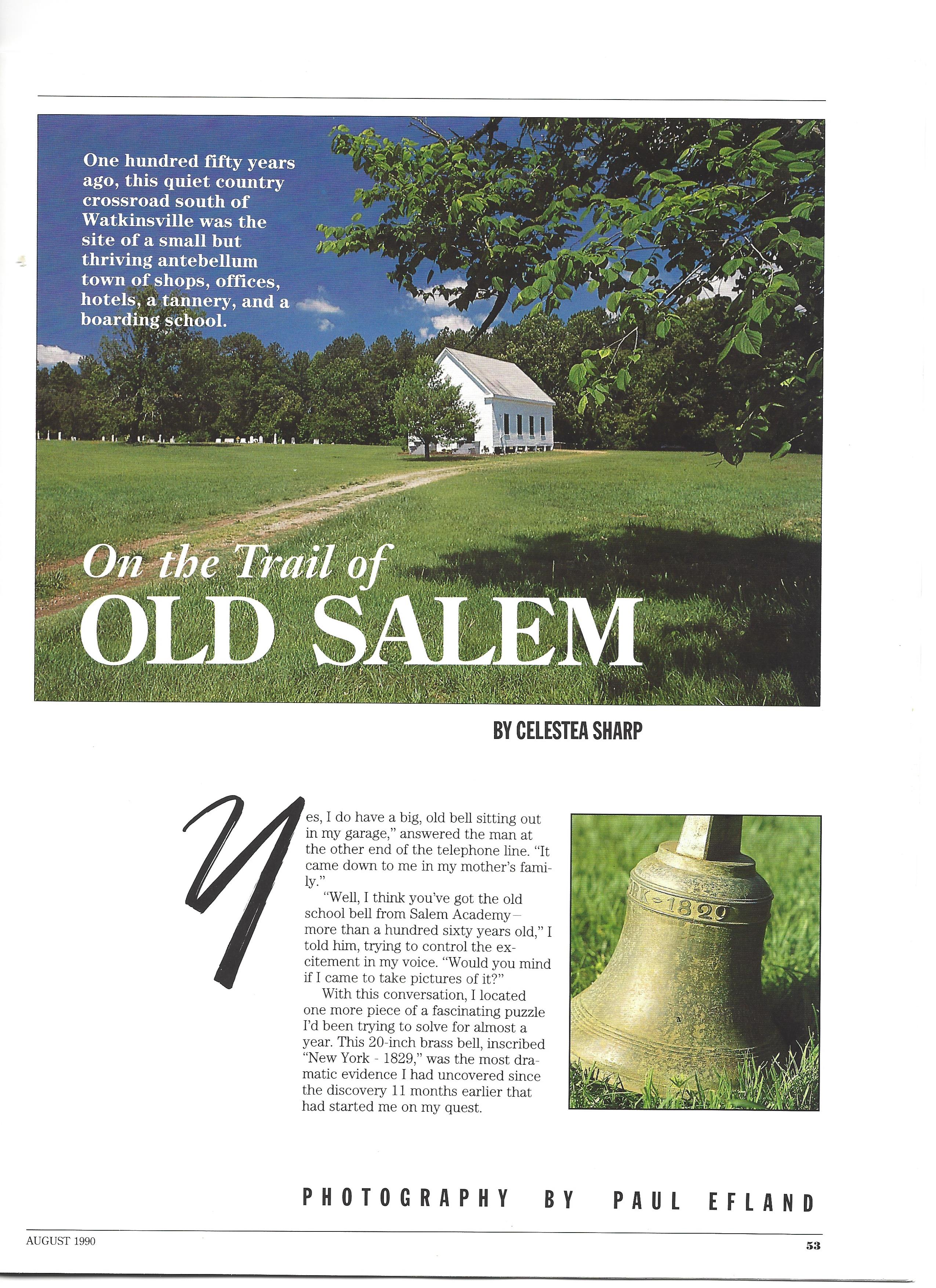 Now… more than one hundred and seventy years ago, south of Watkinsville, Georgia, was the small but thriving antebellum town of Salem with a church, shops, offices, hotels, a tannery, and a boarding school. But, it vanished. Celestea Sharp set out find out about it…This article, which first appeared in Athens Magazine, August 1990, continues below with exclusive permission to the Thrasher Family Association…somewhat edited, abbreviated and updated for our website. Thank you, Celestea for your family detective work!